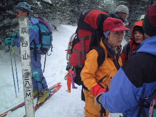 トレースはあるがなるほどわかんは必要だ、と最初は皆思っていた。後ろに回ったつぼ足の清水さん、高見沢さんはわかん組の後でもけっこう足を取られていた。しかし先行トレースは通常の登山道を外れ、メルヘン街道へと向かっていたため、つぼ足隊の難渋を見かねたSL海輪さんはラッセルを断念し、そのままメルヘン街道へ進んだ。そこからはむしろつぼ足の方が楽だった。私たちはわかんを外さないまま歩いたが、必要の無いところで歩き続けることは不自然な歩行になるだけに苦痛ではあった。