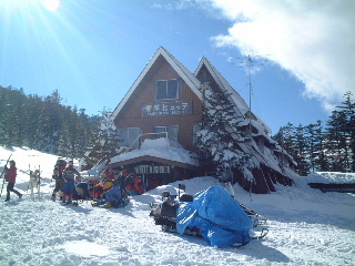 黒百合ヒュッテで大休憩。またもや早く着きすぎたと口々に言葉が出る。トレースがしっかりしていると、雪山はむしろ夏道よりコースタイムが短縮する。そこで一休みするとまたもや体力を持て余した若い西山さんが目の前の小山をよじ登りザーッと滑り台のように滑って遊びだした。見ていると一緒になってやりたくなるが、さすがにその元気はない。