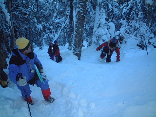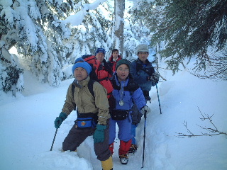 荷物は置いて、空身で丸山に行くことになった。こちらは人が入っていないだろうと期待して、ラッセルの練習とばかりにわかん装着でいざ出発。ところが、こちらもしっかりしたトレースがついていた。わかんなど不要だったが斜面が急で、つぼ足の人は滑るようだった。わかんには下にアイゼン効果のある歯があり、滑り止めにはなった。しかし田中さんのスノーシューにはそれが無い。滑りやすいようで、途中で外していた。空荷といえど、それぞれに少し飲んでいたので「体が重い」の連発。そんな中、海輪さんが木村さんご指名でラッセルの直々の実地講習。この時ばかりは私はカメラマンに転じる。
