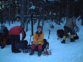 見覚えのある白駒池駐車場そばの入口から白駒池へ。緩やかな登りだが、それだけでも嫌になってしまった。朝一の行動はいつもかったるい。白駒池分岐で木村さんと高見沢さんだけが池まで空身でピストンし、他6名はその場でのんびり休んで待っていた。この間にわかんを外し、アイゼンに変えた。アイゼンは無くとも歩けそうだったが、少しでも傾斜がきつければ、アイゼンを着けていた方が楽だ。