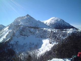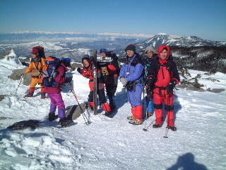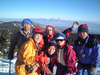 ゆっくりした小屋を後にして、いよいよ中山へ。これさえ登ればあとは楽勝。気温は氷点下12度くらいだったと記憶しているが、登っているとやたら熱く感じられた。思わず手袋を外す(なぜか私だけ)。いったん登り切った所で視界の開けるところがあり、双耳峰の天狗岳が見えてくる。ここが展望台かと思ったら、その先に広い展望台があった。西側が広く開け、それは素晴らしい眺めだった。何一つ遮るもの無く、北アルプス、中央アルプスが望める。この日は最初からすっきりした青空で、どこにいてもどこかしら眺められた。