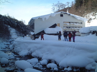 膝に故障を感じていた木村さんが高見沢さんと少し先に下りていった。続いて夫と私が下り、樹氷の中で写真を撮っている間に残りの全員が下りてきた。ひとたび雪が降ればラッセルが大変な雪道も、今回はどこも歩きやすかった。天気が良く針葉樹林帯にも陽が射し込んで、明るく気持の良い登山道だった。わざわざ積雪の中をつぼ足で歩いていく西山さんを見ていると、腰辺りまで雪に沈んでいた。その下に踏まれた雪もあるだろうし、積雪はゆうに1mは超えている。写真を撮りながら、あるいは枝を揺すって後ろの人に雪を落とす時間差攻撃でいたずらしながらのんびり歩いたにも関わらず、やがて木村さん達に追いつき、渋の湯にはかなり早い時間に着いてしまった。