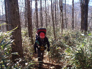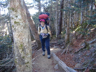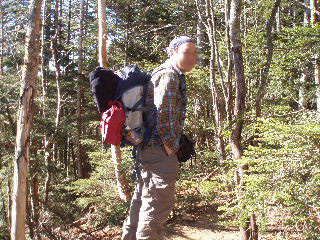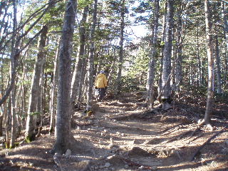 | 空は青空、気持ちの良いお天気の下に歩けば気持ちの良い登山道。 ところが今回は冬山に備えて冬山用の靴(二つあるうちの一つ)にしたものですから、sanaeは踵が痛くなってきました。昨年も数回使いましたが、まだ充分足に馴染んでいません。久しぶりにはいての急登は少々踵に堪えました。 |