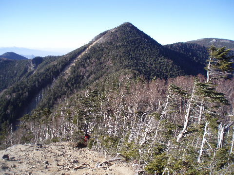 正面に甲武信ヶ岳が見えてきました。 これといって特徴のある山容でもなく、 後から来た男性が「どこがいいんでしょうね〜?」と つぶやいていました。 やはり山頂からの展望なのでしょうね。 ここからも南から北のアルプスが一の字に並んで見えるのですから♪ |