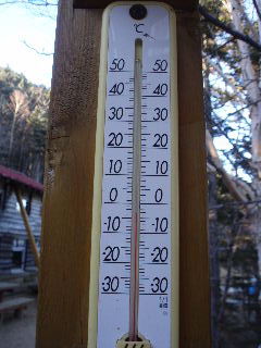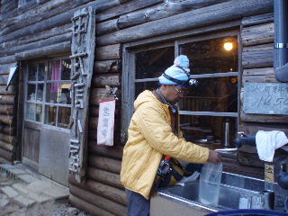 | 小屋に着くと先に着いていたトシちゃんがげんさんといました。sanaeは先にテント場の受付へ。気温はマイナス3度。良いお天気ですが、ここは丁度日陰です。 小屋に入ろうとしたところでヅメちゃんが出てきてご挨拶。中には徳さんが受付をしていました。先ほど先に登って行ったお一人の女性が甲武信小屋のエプロンをつけて、美味しいお茶を入れてくれました。その美味しかったこと!ザックの中は白菜と言っていた訳が分かりました(笑) |
