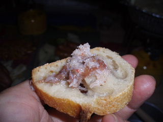 | フランスパンはげんさんがお持ちでした(^^ゞ 高級感たっぷりのカナッペ(で良いですか?(^^ゞ) 酒のつまみに最高ですよん♪思わずプレモル2缶いっちゃいました(あぁ、明日の分が・・・・涙、つうか、2缶持ち上げですか?はい^_^;)・・・重いはずです(~_~;) トシちゃんもいつもより多目に飲みまして、すっかりヨッパー(笑) 話しながらも体がズルズルと横になりたがっています。弱いものでいつもこうなんです、すみませんお行儀悪くて(^^ゞ |