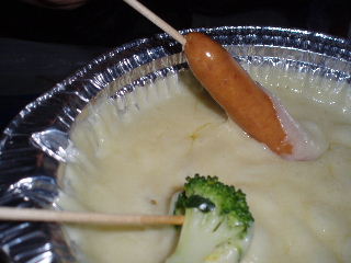 | チーズフォンデュ。ワインなくてもトシちゃんの牛乳で(笑) フランスパン忘れました^_^; ニンニクも忘れたし・・・。でもなぜか分量は3〜4人用(笑) コッヘルを使うと後が厄介なので、洗って保存しておいたコンビニなどの鍋焼きうどんのアルミケースを使っています。 |