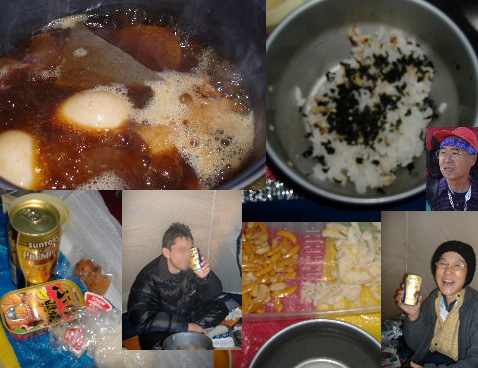 | 先ずはかんぱ〜い♪ フフッ!プレモルが一緒!・・・って、小屋が開いているのに持ち上げたんですか〜って、ツッコミ入りますか?はい^_^; トシちゃんはお気に入りのいつもの梅酒。 |