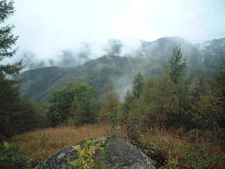 旧道と新道の分岐で少し雨が降ってきた。傘をさし、ピークを踏みながら進む新道の方を行った。下山の時は捲き道を歩こう。上には先行のご夫婦が見えたが、私達がつく頃にはもう先に進んでいた。登り切ったところで長袖を脱ぎ、小休憩。振り返って山並みをみる。ガスがかかっていたが、多分金峰山や朝日岳、国師岳などだろう。一息ついて私達も先に進む。