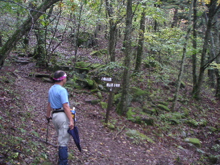 しばらく休んだ後同ルートを下山。今度は旧道の方を通ったが途中的石と書かれた木の杭があった。見上げるとそれらしき大きな岩がある。笹原の捲き道を行くと、大きな岩はいくつかあり、それぞれに趣があった。