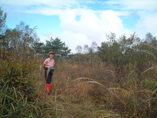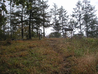 その先のピークも越えるのかと思ったら捲き道になっていた。そして一杯水と書かれた分岐から山頂へと向かう。一杯水には登山道に水が流れていたが、台風の影響かそれともそれらしき取水口があるのかちょっと分からなかった。マツムシソウがまだ咲いていた。緩やかに登っていけば山頂だ。山頂は広かった。手元に地図がなく、遠望はガスがかかっていたので山座同定もせず。傍らに綺麗に咲いていたリュウノウギクを撮って一休み。屋根の付いている素朴な休憩場所がある。座ったと同時に携帯メールが鳴った。娘からだ。この辺りは電波が届くようだ。休んでいる間に晴れ間が出た。青空と太陽の光が気持ちよかったが相変わらず安定した天気ではなかった。