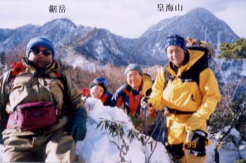 無雪期ならば山頂まで1時間のところ、登るほどに深くなるノントレースのラッセルでその4倍かかってしまった。目印は赤布と木についている四角いマーク(赤と黄色が塗られている)だが、数が少なくて、それがなかなか見つからない。すっぽり隠れている梯子や階段、鎖などを探りながらの前進は5人で交替しても体力を消耗させた。慣れない私や夫に比べ、海輪さんや三郎さんは上手に足場を作っていく。それを見ながら真似る夫も次第に慣れてきた。私はどうも上手に出来ない。急登の場所はなおさら難しい。田谷さんはバイタリテイがあり、楽しそうにがんがん進んでいく。細い体で重い荷物を背負っているにも関わらず、さすが若さにはかなわない。息子よりふたつ、みっつ上くらいだから当然と言えば当然か。