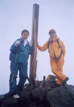 H13年8月13日(月)前夜登山口着天気;曇りのち雨のち晴れ Member.3人(夫婦、娘) 【コ ー ス 】 長者原登山口6:05〜ゲート6:30〜林道から登山道へ6:45〜再び林道へ〜登山道へ〜諏蛾守越(小屋跡)7:55〜(北千里浜)〜久住分れ9:00〜久住山9:25-10:05〜天狗が城10:45〜中岳11:00-05〜分岐?〜法華院温泉13:15-20〜坊ガツル〜(九州自然歩道)〜長者原登山口15:35 【久住山(ガスの中)】右 2001年夏休みは家族三人で九州旅行をし、観光と山行を楽しみました。 今回の中では一番楽しみにしていたのがこの久住山(九重山)だった。美しい山並みを眺めながら歩くのを楽しみにしていたのだが・・・。朝、起きたときには天気が大丈夫だと思っていたのに、昨夜も星が出ていたのに・・。でも山頂の方は確かにガスっていた。 ガスが晴れることを期待して出発。しばらくは林道歩き。登山道に入ってから霧が降るようにあたったが、そのまま歩き続ける。しとった山道は滑りやすい土壌だ。そのうちしっかりした雨に変わってきた。そこで合羽を着ることにした。戻るかどうか、頭に浮かんだのはホンの一瞬。このくらいなら心配はいらないだろうと、気持は先に進んでいた。娘もこのコースを下るのは嫌だったようだ。先に行って滑りやすくないという保証もなかったが・・・。 再び林道に出て、娘はにこにこ。まだこの林道を引き返せるのが分かった安心感だった。私もにんまり、心の中で、早々甘くはないぞ・・・ふふっ・・・と。そんな私に21年育てられた娘、母の心をお見通しで、弱音も吐かずマイペースでついてくる。 石だらけのガレ場を登り出すが相変わらず濃霧の中。しかし黄色いマークがずーっと付いているので登山道を間違えそうな所はない。むしろ晴れているときはうるさく感じることだろう。ひとたびこのようなガスにはまればそれはありがたいものとなる。展望がないため、娘が言い出して山手線ゲームをしながら登っていく。車の名前とか山の名前とか、調味料の名前とか、テーマを決めて順番に言っていくのだが、登りでやるにはエネルギーのいるゲームだった。 登りつめて着いたところは諏蛾守越。すがもり小屋の跡だそうで、今は避難場所のように、石で立派な囲いがされてあった。そして鐘が設置されていた。この先北千里浜は広々とした平原で、道を間違えやすい場所だと言って、途中から一緒だった山口県の男性は引き返そうかと迷っているようだった。そこから法華院温泉の方へ抜けるコースもあるので、私たちはそのまま様子を見ながら先に進むことにした。 河原のような北千里浜に下りると、大きなテントが一つ。中から若い男性の声が聞こえてきた。側に細々とした流れだが、水が流れているのに、こんな場所でビバークしていいのかなと思いつつ、先の様子を見ると、やはり黄色いペンキマークがずっと続いている。うーん・・・と、こんな日に歩く自分たちを棚に上げて、複雑な思いであった。やはり、天気の時に歩くと気になるのだろうな・・・この多すぎるマーク。しかし百名山となると来る人は多い、事故も多かったのではないだろうか。 というわけで安心して進行。靄った幽玄な風景もまた素晴らしい。こんな日でなければ、それこそこの風景を眺めることも出来ない。3人で喜ぶ3バカ家族である。 どこであったか、途中で子供3人くらい連れている家族と出会った。昨日一日かけて7つの山頂を登ってきたという。若い両親の明るい笑顔が素敵だった。子供達の頑張っている顔も印象的だった。この日は下る途中で休んでいたようだったが、こんな日でも楽しい思い出に残ると良いね。 久住分れに着くと牧ノ戸峠や三愛高原方面から登ってくる道と合流。そちらから登ってくる家族に出会ったが、みな傘を持って、合羽を着ていない。荷物も軽そうで軽装だ。この後久住山頂へと踏みならされたルートを辿っていくが、その間出会った人、山頂で出会った人、ほとんどが軽装だった。私たちは一応ツエルトや救急用品、ザイル等用意しているのだが、ライトすら持っていないのではと勘ぐってしまうのは、いらぬお世話か?・・・この日は終日濃い霧だったため、気になってならなかった。 山頂へは次々に人がやってきた。濃霧で遠望どころか人がやってくる姿も10メートル先くらいでもう分からなかった。休憩していると寒くなる。温かいスープやコーヒーが有り難かった。九州の、この夏のさなかにである。 さてこの後はどうしたものか。展望はないからさっさと坊ガツルの方へ下ろう・・・ 今回地形図を持ってきていないため、頼りはエアリアマップなのだが、やはりこの濃霧の中ではイマイチよく分からない。分岐で表示がなく見当がつかなくなったため、ひとまず登る方を選んでみた。おそらく中岳だろうと思ったのだが、途中下りてくる人に聞くと山頂は天狗が城山だという。えっ?そんな山地図にはない、とその人の地図と見比べると私のは2000年版、その人のは2001年版だった。何というショック。