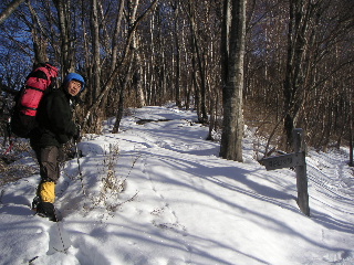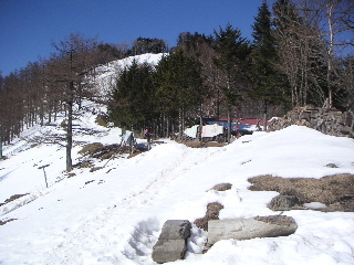 七ツ石分岐のあたりで念のためアイゼンをつけた。しかし雪の無いところが出てきたり腐っていたりして、要らなかったようだ。ブナ坂を過ぎ、今日の目的地奥多摩小屋に着いたところで外した。荷の重さがさすがに堪えていたが、まだ13時。少し時間が早い。テントを張ってのんびりしたいところだが、山頂避難小屋までは夏道で1時間弱。明日早朝登るよりはと、一休みしてからまたゆっくり登ることにした。 |