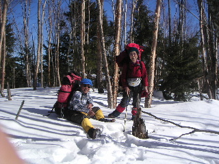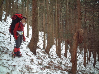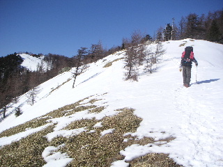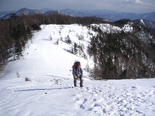 大ダワまで男坂を下る。分岐から芋の木ドッケを登る。踏み跡はあったがやはり行く人は少ない。途端に歩きにくい登りになった。山頂までの標高差は236m。急でかなりきつい。 山頂を過ぎると雑木林が広がって明るく気持ちよい。そこで大休止。 そこへ長沢背稜から登ってきた人がいた。わかんを履いていた。下るとなるほどわかんの快適そうなのが分かる。私たちは今回わかんは持ってこなかった。つぼ足はズボズボはまって極端にペースが落ちた。 |