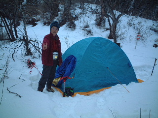 この捲き道がとても長く、16時半ごろ、酉谷の避難小屋手前でテントを張ることにした。酉谷の避難小屋は小さいが快適だったのでお気に入りだったのだが、結局翌日の酉谷山へ行くにはこの方が良かったことになる。 夕食はペミカンのビーフシチュー。せっかく作ってきたのに夫は疲れ果てあまり食欲なし。それでも今日もおでんと梅酒のお湯割でかんぱ〜い! 寝入りばなに雪が降り始めたらしくテントにあたる音。 |