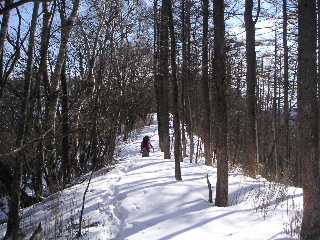 立川駅で乗り換え。青梅線は相変わらず寒い。温かかったら少し眠れたのに・・・。奥多摩駅から鴨沢西行きのバスに乗る。乗客7人、うち6人が鴨沢下車だった。身軽な単独者を見送ってのんびりと登っていった。歩き始めはまだ雪が無い。スパッツはつけず。雪が出てきてもシャーベット状でアイゼンをつけるほどではない。緩やかな傾斜で今のところ夫の調子も良いようだ。八ヶ岳の寒さを体験したばかりのせいか、零度が温かく感じる。 |
