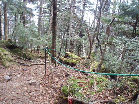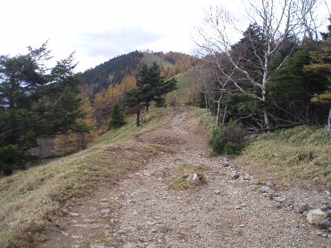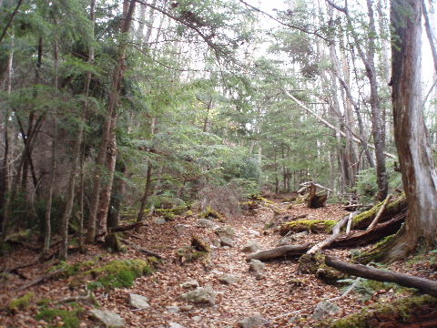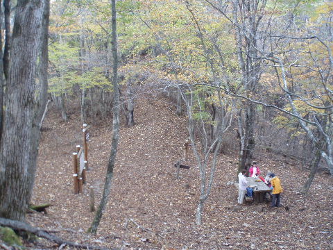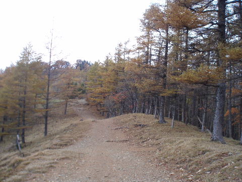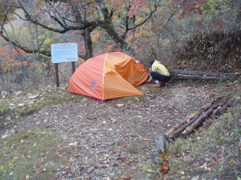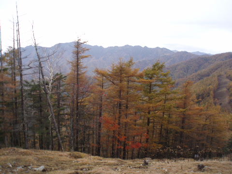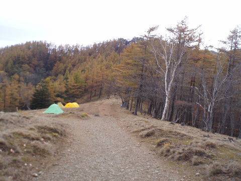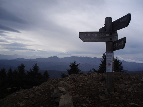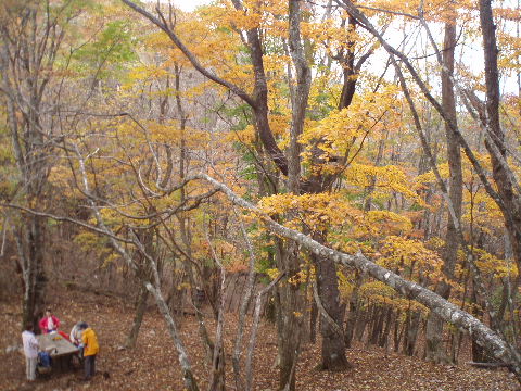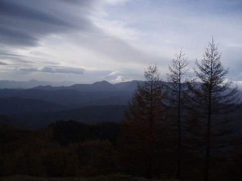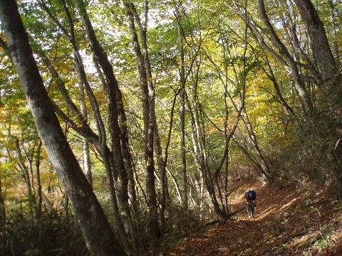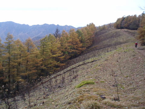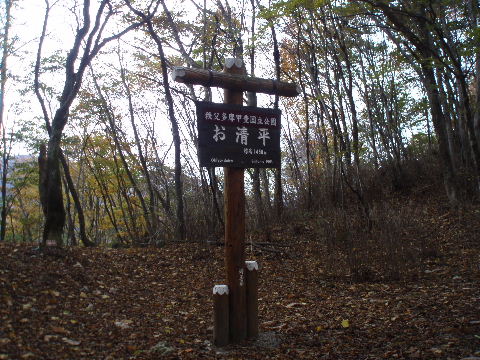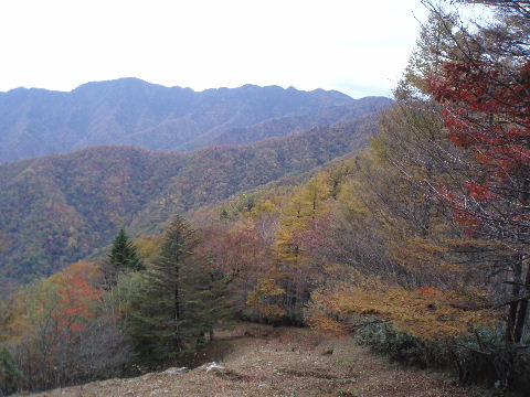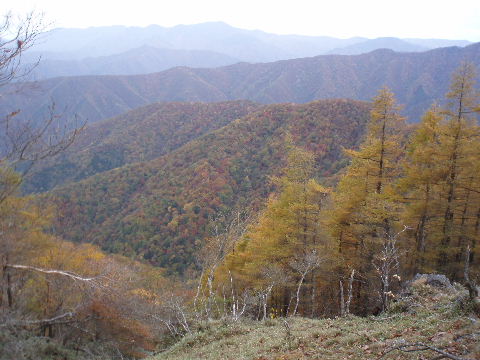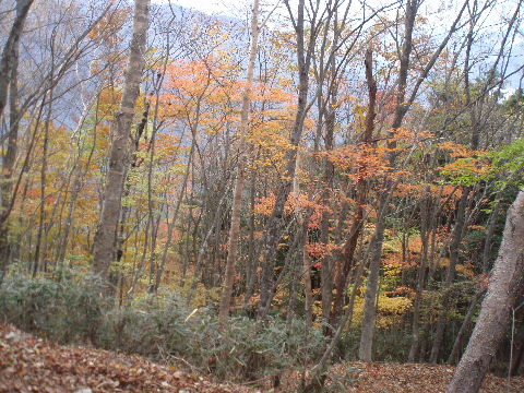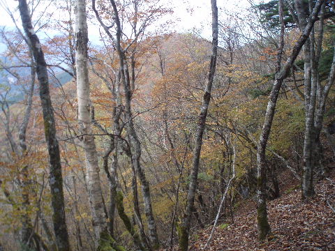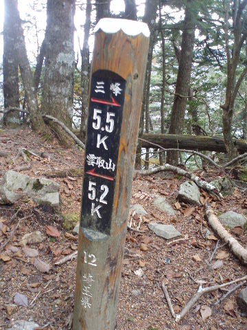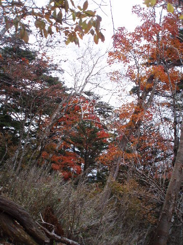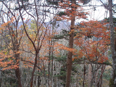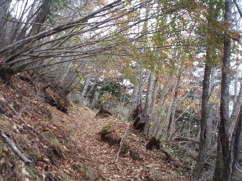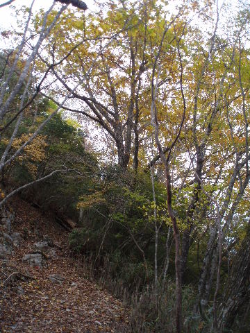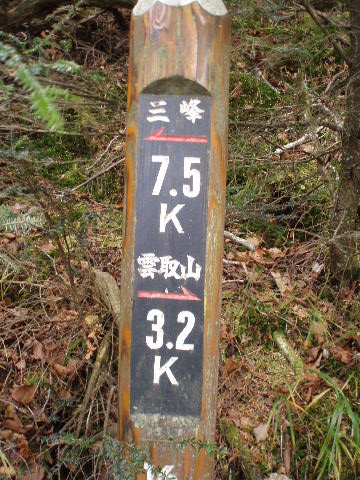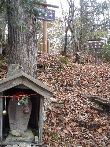 | 夜中の雨音で、起きたとき雨だったら鴨沢へ下山してしまおう、そして 小雨だったらテントを置いたまま雲取山ピストンかな・・・と夢うつつ。 暗いうちから起きる気にもなれず、5時20分ごろ起床。 たっぷり快眠、快適!(^^♪ 外を見ると雨があがっています♪ おまけに富士山までうっすらと見えました♪ 昨夜の残りで雑炊にしてしっかり朝食を済ませ、 テント場を後にしました。 お隣さんはテントを置いたまま雲取山ピストンして 石尾根を下るそうです。 ![]() 私は分岐から七ツ石山へ登ってから雲取山へ向かうことにしました。 きついと思われた急登は歩き始めで元気があるせいか難なくクリア! すごいぞ!(<自画自賛!笑) 分岐を過ぎ、石尾根稜線に出て左の七ツ石山へ。 途中の祠にごあいさつ。 ![]() そして七ツ石山山頂。 山頂の木々はすっかり落葉。 ![]() でも山頂からの展望は素晴らしい。 【雲取山方面:七ツ石山山頂より】 ![]() 【大菩薩嶺方面:七ツ石山山頂より】 ![]() 七ツ石山下り・・・この山稜から派生する尾根筋の紅葉がとてもきれい! ![]() ブナ坂・・・落葉松の黄葉も♪ ![]() ブナ坂から登って七ツ石山を振り返ったところ。 ![]() 再び雲取山に向かって。 山火事に備えての防火帯が開放的な登山道。 雪が降るとなだらかな斜面がきれいですし 春から秋にかけてはお花畑・・・ 今はマルバダケブキの名残がいっぱい・・・ ![]() 稜線の木はほとんど落葉。 それでも視界がいいと、昨日とはまた違った秋の風景に! ![]() ヘリポートが見えてきました。 周囲はここも落葉松林がきれいでした。 ![]() ![]() ヘリポートをすぎればテント場。 もうすぐ奥多摩小屋です。 昨夜は奥多摩小屋でイベントがあるから混んでいるだろうと、 七ツ石小屋のおじさんから聞き、 七ツ石小屋にしてラッキー♪と思っていました。 ![]() でも、もしかしたら・・・ ![]() ・・・なんて思いつつ、向かった奥多摩小屋。 テント場は3,4張り残っていただけでした。 (テント場一人400円。水場あり) ![]() 一休みしてザックを背負い、出発しようとしたら・・・ ん? 「あ”〜〜〜!いじるさん!」 もしかしたらここに居るんじゃないかな〜と思っていたご本人が目の前に! 今年の2月、サイテイの奥多摩JOYで、heppocoさんを通じてお知り合いになったのでした。 ![]() いじるさんと別れ、再び雲取山へ。 途中振り返ると奥多摩小屋(見えないか・・)とテント場。 そしてその向こうに七ツ石山。 ![]() 朝見えていた富士山は出発するころ隠れてしまったのですが 傘をかぶった富士山がまた姿を見せてくれました。 ![]() 前方にはようやく雲取避難小屋も見えて! 七ツ石小屋からだとさすがに早い!(笑) ![]() 富士山(ズーム) ![]() あと少し♪ ![]() 避難小屋の前からも富士山♪ ![]() 雲取山山頂 9:40 ![]() 雲取山山頂には現在の三角点の他に明治のころ(M16−1883年)の 「原三角点點」というのがあります。 いままであまり気にしていませんでしたけど、 現在の建設省国土地理院ではなく、 当時は内務省地理局の管理だったそうです。 大きな立派な三角点で改めてじっくり眺めてきました(^^ゞ ![]() 山頂ではちょうど百名山60座目という、岐阜県の男性がいらして しばし話が盛り上がりました。ここ数日百名山をめぐり、 明日は両神山へ行かれるとのこと。 三峰口ピストンということで、急いで下りていかれましたが どうぞお気をつけて。ご無事に完登されますように♪ ![]() 続いて私も下山。 雲取山荘。 昨日遅くに出会った4人組は無事に山荘に着いたでしょうか? ![]() ![]() 大ダワ。 先ほどの男性がいました。 少し休憩して再び歩き出しますが、 もう出会うことはありませんでした。 ![]() ![]() ![]() ![]() ここからは紅葉と原生林ロード♪ ![]() ![]() ![]() 雲取山を下山し、大ダワを通り過ぎ、あとは三峰口へ向かうだけ。 彩の国、埼玉県へ突入。サイテイ委員の任務遂行な気分です。 (今頃委員長と美人秘書殿は○○かな〜・・・いえ、いいんですよ(^_-)-☆) ![]() まだ雪はまったくありませんが・・・ 積雪時はご注意ください。 ![]() こちら寒さにドライフラワー化していますけど・・・ ![]() 梯子や手すりなど整備されて。 ![]() ![]() 雲取山〜三峰口間は10、7キロ。 要所にこのように目安がわかるようになっています。 ![]() 芋の木ドッケ 芋の木=コシアブラ(てんぷらなどにするとおいしい)、 ドッケ=突起がなまったもの。 コシアブラの木の多い、とがった峰につけられた地名。・・だそうです。 こんな説明書きがちゃんと傍にありました。 ![]() コメツガやシラビソの若木が多い・・・ 新旧入れ替わり?と思ったら、 台風による森林破壊の回復中のようです。 ![]() ![]() 白岩山山頂。展望はありませんが、 寛げるような木のテーブルと椅子がありました。 丁寧な説明書きの看板がいくつか並び、 それには森の様子、動植物のことなどが書かれていました。 他に目を引いたのはこの山頂がかつて台風によって 森林が破壊されたということ。 昭和34年の伊勢湾台風で破壊され、明るくなった山