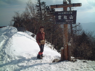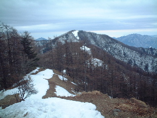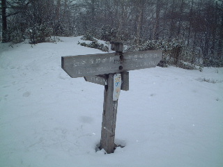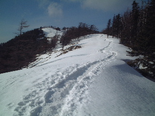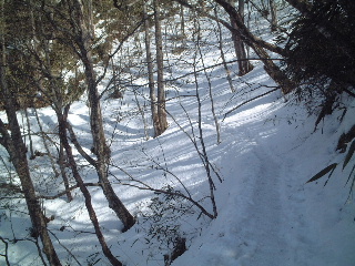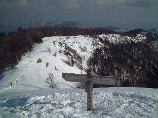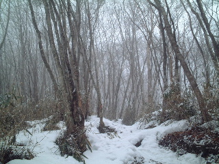 このコースは緩やかな登山道で歩きやすい(下りはやたら長かったという記憶がある)。そして2月というのに雪がない。今回迷ったあげく、用心のためにとわかんまでもってきたのに結局使用せず。時々アイスバーンになっていたが、アイゼンをつけず気をつけて登っていく。しかし3時間くらい歩いた頃だったろうか、下山者とすれ違い、ここはツルツルだからアイゼンをつけた方が良いと言われた。10分くらい行けば後はいらないと言われたので、それならつけなくてもいいか・・・と安易にそのまま行った。が、やっぱり滑る。荷物が重い分少しでも滑れば不安定になるので慌ててつけた。わずか数分のその間だけ通り過ぎてから外し、ザックの後ろにぶら下げておいた。しかしこの日、登りで使うことはなかった。 ここは下の方は杉の植林で、花粉症の私は3,4月は歩きたくないなと思った。でも上に行くほどにブナ林が広がって気持ちのいい空間だ。新緑の頃もいいだろう。そして紅葉の時期も。