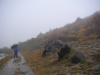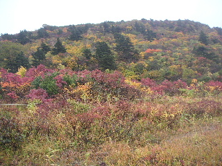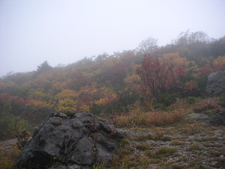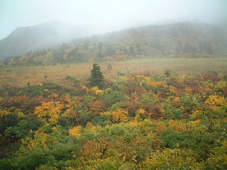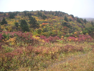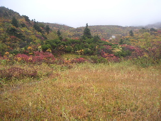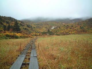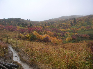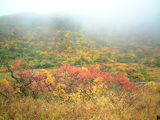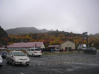 | 秋田と岩手の県境にある須川温泉の駐車場は空いていた。数台停まっている車は多分湯治客だろう。 周囲の紅葉はさすが目を見張る。 山頂方向はガス。少しだけ栗駒山頂らしい姿が見えた。 |