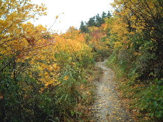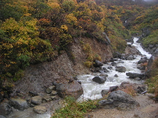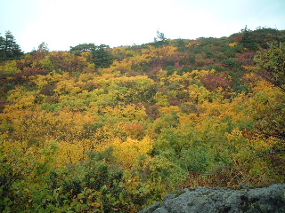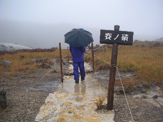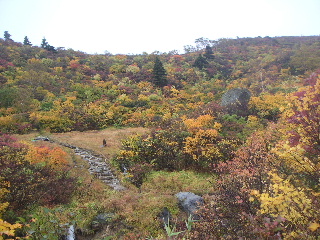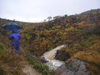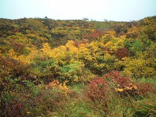 | 14:25 駐車場へ。 このあと岩手県側の須川高原温泉へ。露天風呂は寒かったのでパス。内湯の千人風呂へ。乳白色の温泉。温泉に入ってる〜という感じだった。1時間500円。 一日ゆっくりして翌日もう一度栗駒山に登ろうと思っていたが、紅葉は満喫したし、以前一度山頂まで行っているのでこのまま下山。荒天を逃れて南下することにした。 |