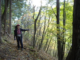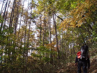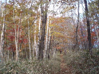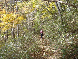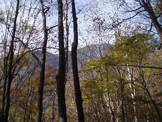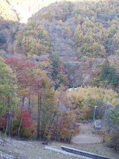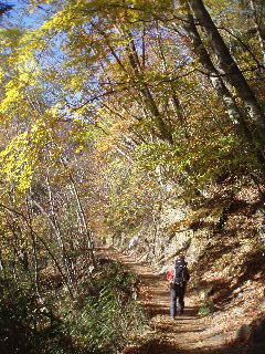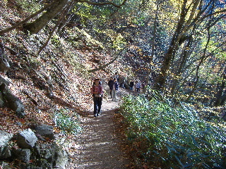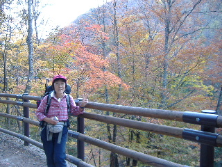 | 山の斜面はきれいな紅葉。できれば七ツ釜五段ノ滝など眺めながら歩きたいのですが、車回収のため最終バスに間に合わせなければ・・・と右の山腹ルートを急ぎました。 |