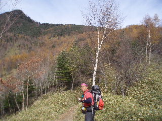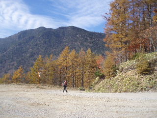 これまで登山者に会いませんでしたが、この林道を走ってくる車も二輪車もありませんでした。途中でゲートが閉まっているのかどうか、未確認ですが、この情景を見てトシちゃんはガッカリした声。でもいいじゃありませんか!お陰できれいな紅葉が見れたのですから〜♪ |