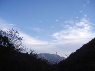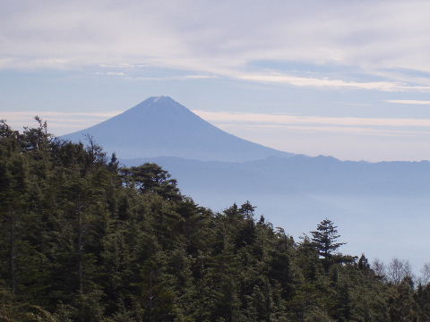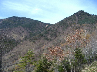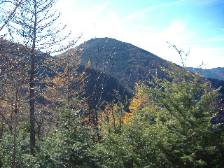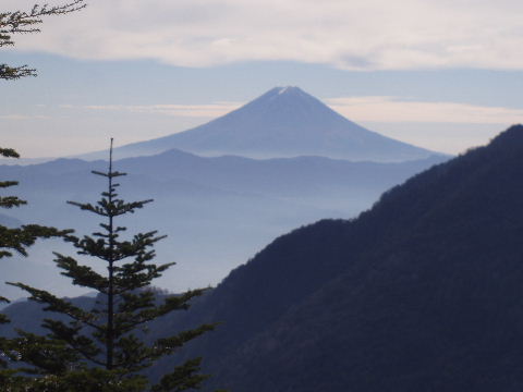 途中、木の間から見えてきた山。最初は乾徳山かなと思っていました。 |