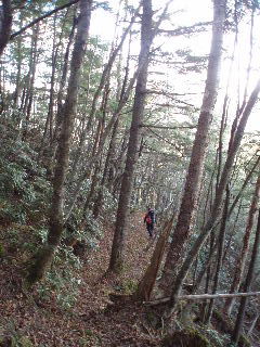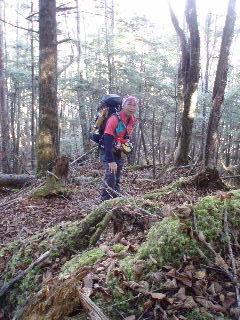 稜線から下山にかかると倒木など多く不鮮明な登山道になりますが、要所にはテープなどついていました。 |