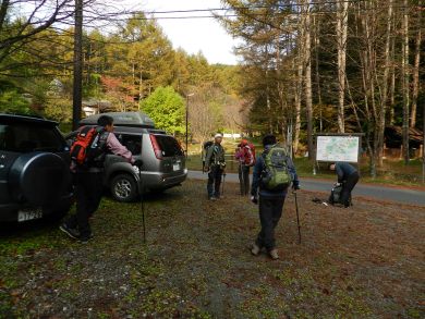 途中、中央道の境川PAで仮眠し、6時半ごろ集合場所のマウントピア黒平(くろべら)へ。 駐車場に着き、その旨メールを送信して間もなくヨッシー隊、みちほさん夫妻が到着。 みちほさん夫妻とは先週のニアミスもあり、会うなり思わず互いに笑ってしまいます。 皆さん初対面ではありませんから久しぶりの・・・といってもブログではいつも拝見していますから久しぶりという気もしませんが和気あいあいと雑談しながら準備します。 駐車スペースはそれなりにありますが、他に停まる車もなく、下山後も我らだけでした。 |