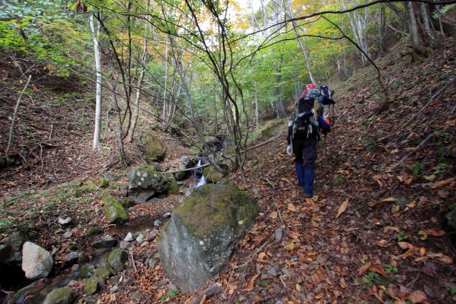 しばらくはせせらぎの音を聞きながら沢沿いを行きます。 途中右左へと渡渉しますが登山靴で問題ありませんでした。 気温は9,8度(8:35) |