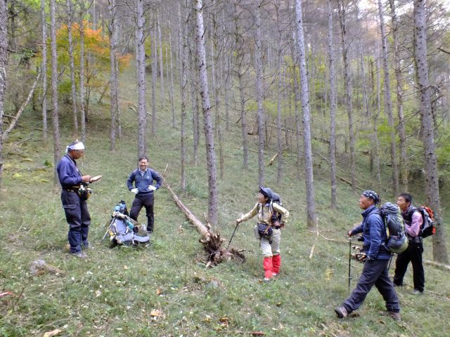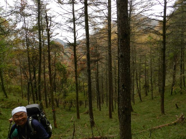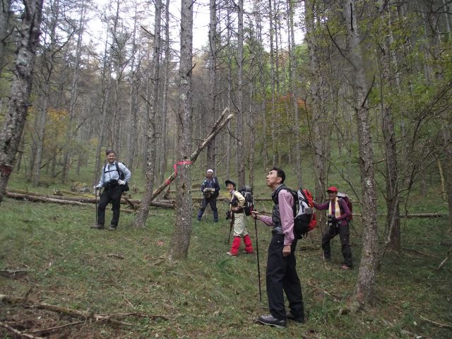 このあたりの落葉松は早くも落葉。 お蔭で足元がふかふか。 空が明るく開けているようでした。 (phot by Mr.& Ms.Michiho) |