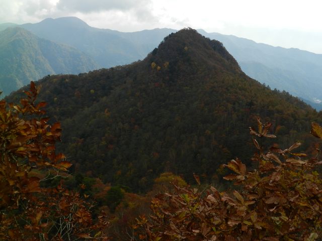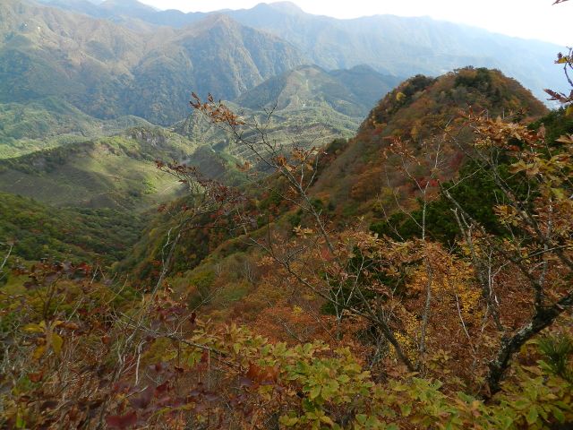 少し右に移して 左に曲岳、右にさっきまでいた升形山。 斜面の紅葉がきれいです。 |