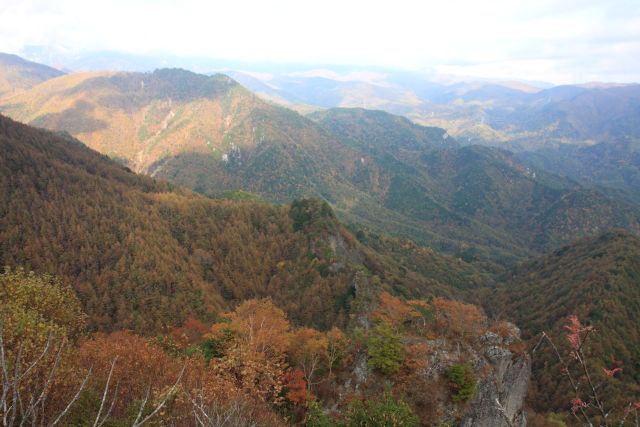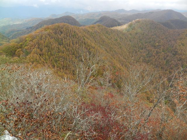 | 南側の展望 奥は御坂山塊方向かな? 相変わらず富士山は雲の中。 谷あいに至る斜面の紅葉もきれいでした。 裾野に燕岩・・・どんな岩なのだろう?^^; |