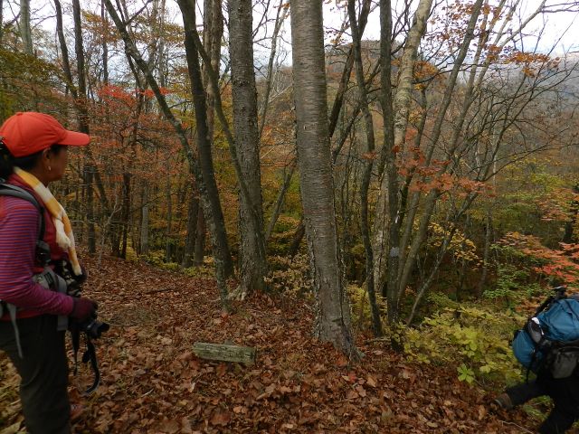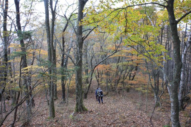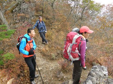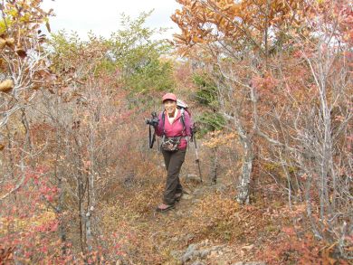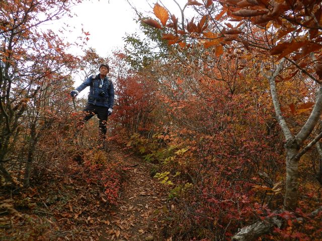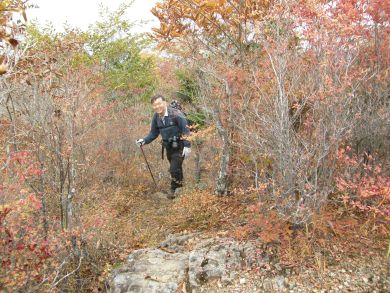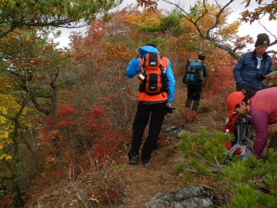 | 山腹の紅葉を愛でて下山します。 トータル1時間ほどの山頂でした。 (phot by Mr.& Ms.Michiho) |