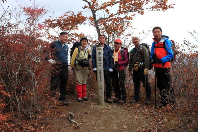 こちらは下山する前に写した山頂記念写真。 山梨百名山、5年前に来たとき丁度付け替えられた山頂標柱です。 (phot by Mr.yossi) |