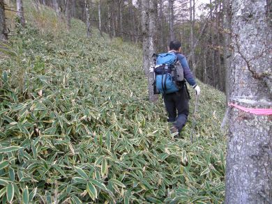 ピンクのテープに導かれていきますが 足元の笹は登山道を覆い隠してしまいそう。 |