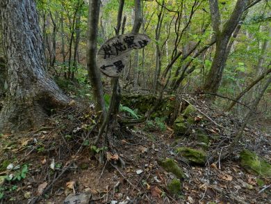 朝のルートに戻り、 往きに気づかなかった炭焼窯跡 生活の跡、いつまで使われたものか、苔むしてます。 |