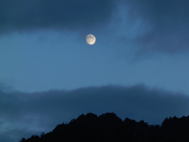 | マウントピア黒平に着いた頃(16:30頃)には 夕暮れの空に満月(10/30)に近い月。 |