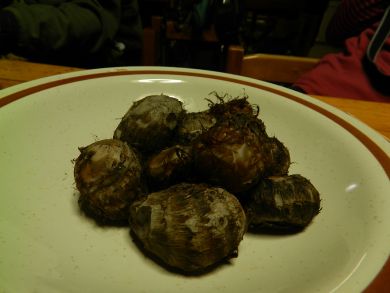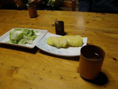 ヨッシーさんがお馴染みの管理人さんに挨拶に行くと、外で待っていた私たちにもお茶をふるまってくれるということで中へ。 手作りの白菜漬けと昨日漬けたという大根、蒸かした八幡芋(里芋)、温かいお茶。とても美味しく戴きました。温かいおもてなしに気持ちも温まりました。 今日の山行の話などしながら、情報収集したり、管理人さんの思いを聞いたり。このルートをもっとたくさんの人に知ってほしい、もっと歩いてほしいということでした。 こちらでいろいろな企画もされているそうで、翌日はお祭りだということでした。 |