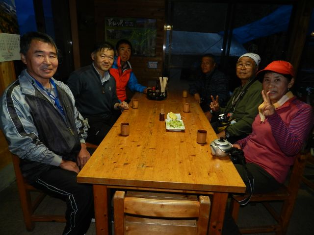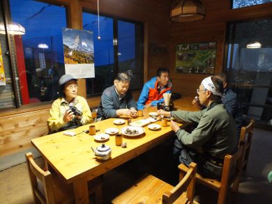 翌日の山行は雨のため中止になりました。雨予報は変わらず中止を見越してこの夜は飲んで食べておしゃべりして、楽しい時間、充実した一日でした。皆さんどうもありがとうございました。 |