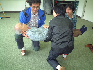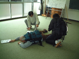 天気;雨のち曇り Member.7人: 今井(講師)・柴田・川口・蒲原・本多 山口(途中出席)・石原(記録) 右【ログロール:三人で負傷者を運ぶ】 当初実地訓練も予定されていたため、近くの屋外で行われるはずだった。しかし雨の予報で急遽室内での講習に変更された。それぞれの事情で参加者が減り、6名となった。途中で一時山口さんが参加。 今回学習したことは、山岳事故に遭遇したときの対処、救急処置と安全な救助方法等、広い室内で机上と実技を交えて学んだ。雨が上がったため外での実地訓練も出来そうではあったが、移動の時間がかかるためそれは中止。講習は少人数だったため分かりやすく、納得のいくまで質問することができてよかった。