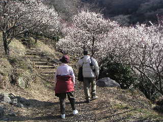 | 朝早いためまだ混みあってはいなかったが、それなりの人がいた。大きなザックでガサガサと足早に脇を通り抜ける人、クライミングの人たちだ。 いちおう母のためにストックは家から持ってきたのだが、夫から「今日は登らないだろう?」と先手を打たれた。だって梅林は山の斜面よね・・と思いつつ、そこも歩かないで広場から眺めるだけなのかな?なんて気をまわして車内に置いてきた。でも幕山公園と書かれたところまで行けばやはり散策コースを行くことになる。ここだけだってストックがあった方が楽なのに・・・。まっ!いいか! 散策コースを歩いていると、上着を脱ぐくらいの暖かい陽気でとても気持ちよかった。たくさんの白梅、紅梅が満開でまだつぼみの梅も多い。 散策コースには幕山ハイキングコースとも書かれており、ゆっくり登って行くと早くもザック背負ったハイカーが下りて来る。それとなく夫が「上まで行ってみる?」と母に笑いながら聞いている。すると「いいよ」と母の返事。じゃ行ける所まで行ってみようか・・とのんびりと歩いていった。 |