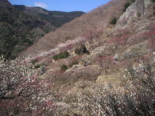 | 今日の幕山、湯河原梅林は満開でとてもきれいだった。梅の開花時はいつも大勢の人で賑わっているが、山の裾野を彩って風情を感じる。その上山頂までのハイキングが楽しめて展望も良い。数ある梅林の中でも一番好きな梅林だ。 いつもは2月中が見ごろだが、今年は異常気象のせいだろうか例年より開花が遅い。実は先月の中旬過ぎに母と約束していたのだが私が風邪でダウン、今年はもう無理だと思っていた。ところが二・三日前、たまたまテレビで今が満開という放送を聴き、この日行くことにした。気温が低いという予報が気になったが思い切って行ったのは大正解。現地は晴れ、風も無く穏やかな陽気になった。そして陽気につられ母も一緒に山頂へ。 |