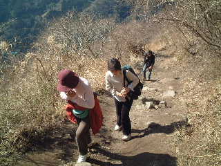 ようやく着いた山頂はまだ人が少なかった。山頂まで来るといささか風が冷たい。風をよけた場所で一休み。持ってきたサンドイッチと温かい飲み物で1時間ほどゆっくり休んでいる間に山頂はあっという間に賑やかになっていた。しかも下山していくと、次から次へとひっきりなしに登ってくる人とすれ違う。山頂はさぞや・・とその情景を見てみたい衝動にかられた。「もう一回登ってきたら」と母にからかわれ大笑い。数少ないが咲いていたスミレ、山で見るのは今年初めてだったかもしれない。キラキラ輝く相模湾に突き出た真鶴半島や初島、大島など眺められ、吹き上げる爽やかな海風はまだ少し冷たいが春を感じる。 |