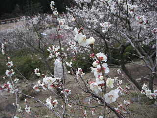 駐車場に着いたのは8時前。営業は9時からということで手前の駐車場にしか入れず、そこから歩くことにする。9時までは無料だそうだが無論それまでに戻れるわけが無い。駐車場はかなりあり、どこも一回500円。たくさんあると思えた駐車場だが私たちが帰るころには満車で並んでいるほどだった。 歩いて幕山公園へと向かう。裾野に梅林が見えてくるが全体に白っぽい。近くまで行くと白梅が満開で紅梅のほうはまだこれからという木が多かった。 梅祭り「梅の宴」の開催期間は1月29日から3月13日、つまりこの日までだったが開花状況が例年より遅れているため3月21日まで期間延長になっていた。これから紅梅やしだれ梅が見事に咲き誇るのだろう。 |