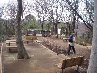 | 生田緑地の一角に着きました。前方に休憩場があり、向こうの稜線に枡形山山頂の展望台が見えてきました。 | |