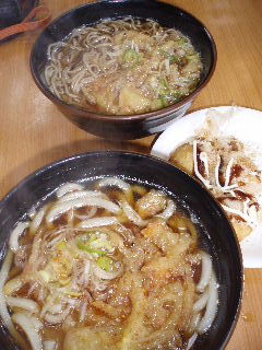 | 先ずはエネルギーを補給です(^^ゞ 海老かき揚げのうどんとそば、各400円。たこやき一皿350円。 天ぷらはその場で揚げてくれてサクッとした食感がなんとも嬉しく、お味も美味しかったです。 |