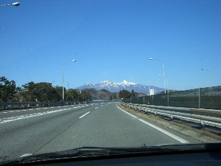 | 外はいい天気。三人の中ではまぁまぁ一番元気の良さそうな?私の運転で出発し、中央道へ。 早朝割引も通勤割引も使えない時間帯になっていたせいか、高速道はご覧のとおり空いていた。長坂ICに近づくと前方に八ヶ岳が見えてくる。空は真っ青、気持ちの良い天気だ。 双葉SAで食事した後は娘の運転に変わっていた。長坂IC出口へ向かうと目の前に南アルプス(特に甲斐駒ケ岳)が大きく広がり圧倒される。 |