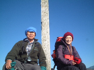 | 山頂で。先ほどの若い人に撮ってもらう。「景色の方が大事ですか?標識の方が大事ですか?」と尋ねてくれるがトシちゃんの答えは「顔が大事!」と。すかさず私も「顔が命!」と・・・おいおい!(モチロン冗談ですって!えっ?分かってる?(((^o^))) その結果、どこだか分からないショットになってしまった。ただ元気の証ということで・・・ |